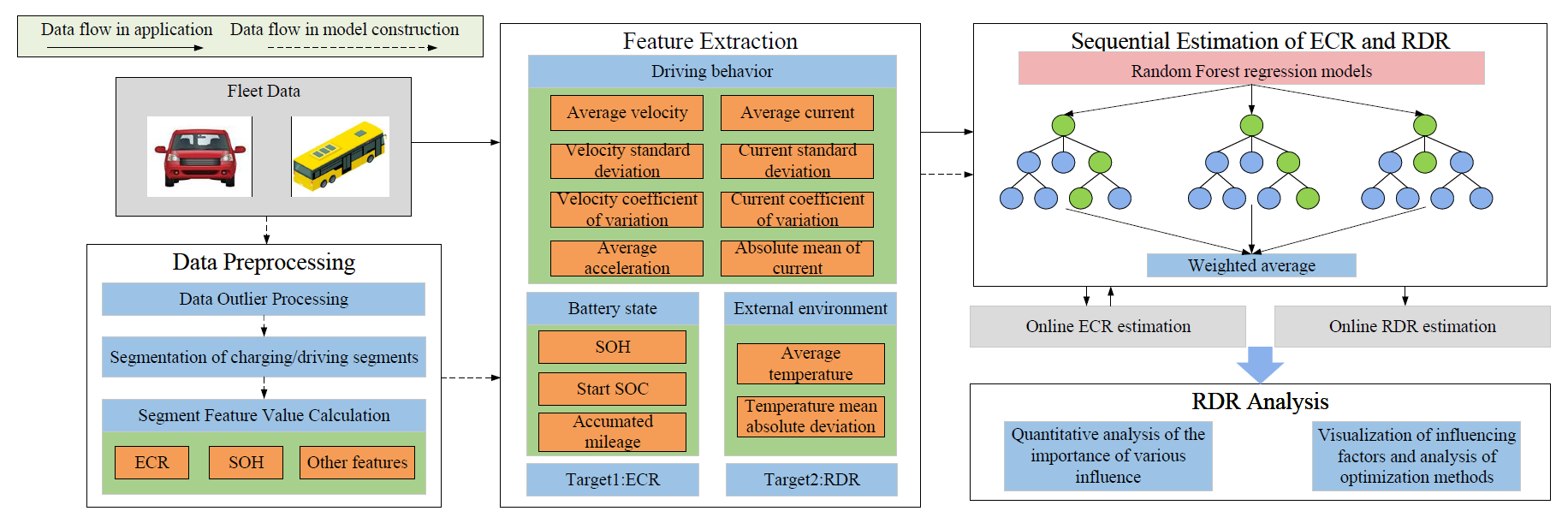 当前,电动汽车的推广应用仍受“续航焦虑”制约。现有预测方法多依赖仿真工况或小样本测试,难以准确反映不同地区气候条件、路况及车辆类型之间的实际差异。针对这些工程实际中的关键难题,研究团队构建了一个面向实车应用的在线续航估算与优化分析一体化框架。该框架综合考虑驾驶行为、环境温度、电池健康状态(SOH)等多源因素,通过随机森林算法实现“先能耗、后续航”的分步估算:首先建立单位里程能耗率模型,进而基于能耗率推算剩余续航里程。相比直接黑盒预测,这种分步建模方式既提高了预测精度,又显著增强了模型的可解释性,能够定量回答“什么因素在什么程度上影响续航”。